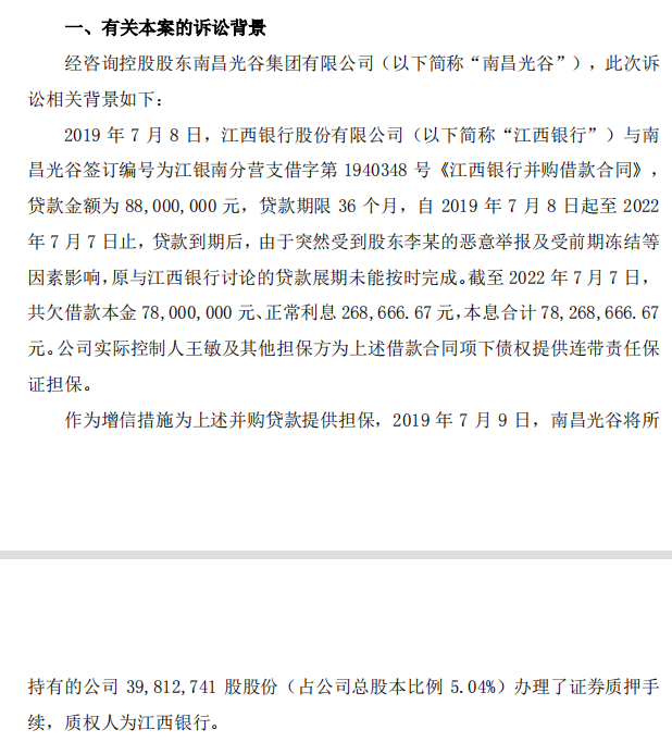 2022年7月30日长方集团披露了南昌光谷与江西银行的贷款纠纷。公告显示,截至2022年7月7日,南昌光谷共欠江西银行借款本金7800万元,利息26.86万元。2022年7月15日,江西银行将南昌光谷、王敏等相关担保方及关联主体告上法庭。