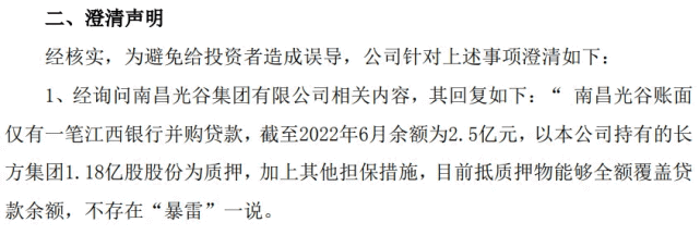 。根据长方集团2022年7月1日发布的澄清公告显示:截至2022年6月,南昌光谷在江西银行的贷款余额为2.5亿元,以南昌光谷持有的长方集团1.18亿股股份为质押担保。