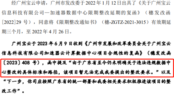 但广州宝云至今未完成整改。2023年6月9日,广州宝云收到广州发改委最新的复函显示,“由于广东省至今仍未明确关于违法违规数据中心整改的具体标准和路径,该项目暂无法完成我委提出的整改要求。”