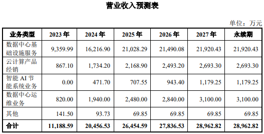 草案中,对广州宝云未来营收进行预测。评估认为,广州宝云未来数据中心基础设施服务峰值将是去年营收的3倍;数据中心运维营收达3100万元;云计算产品将上升至近2700万元;AI节能系统将于明年起贡献营收。