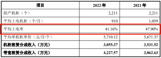 草案显示,广州宝云平均上电机柜2022年仅910个/月,平均上电率41.16%,在2021年上电率还有47.90%。这一数据远低于行业平均标准。