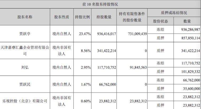 截至2019年第一季报,目前公司前十大股东名单中,天津嘉睿汇鑫企业管理有限公司持有比例8.56%,持股数3.41亿股;刘弘持股1.18亿股,持股比例2.95%;贾跃民持股6676.2万股,持股比例1.67%;乐视控股持股2388万股。