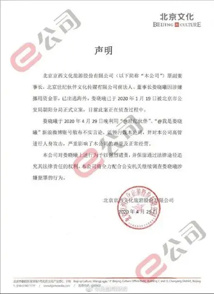 对此举报,北京文化深夜发布声明回应娄晓曦实名举报公司财务造假:公司原副董事长娄晓曦因涉嫌挪用资金罪,已出逃海外。