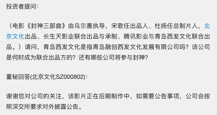 现在北京文化手里还有很多电影项目。尤其《封神三部曲》,联合投资方会瑟瑟发抖吧。