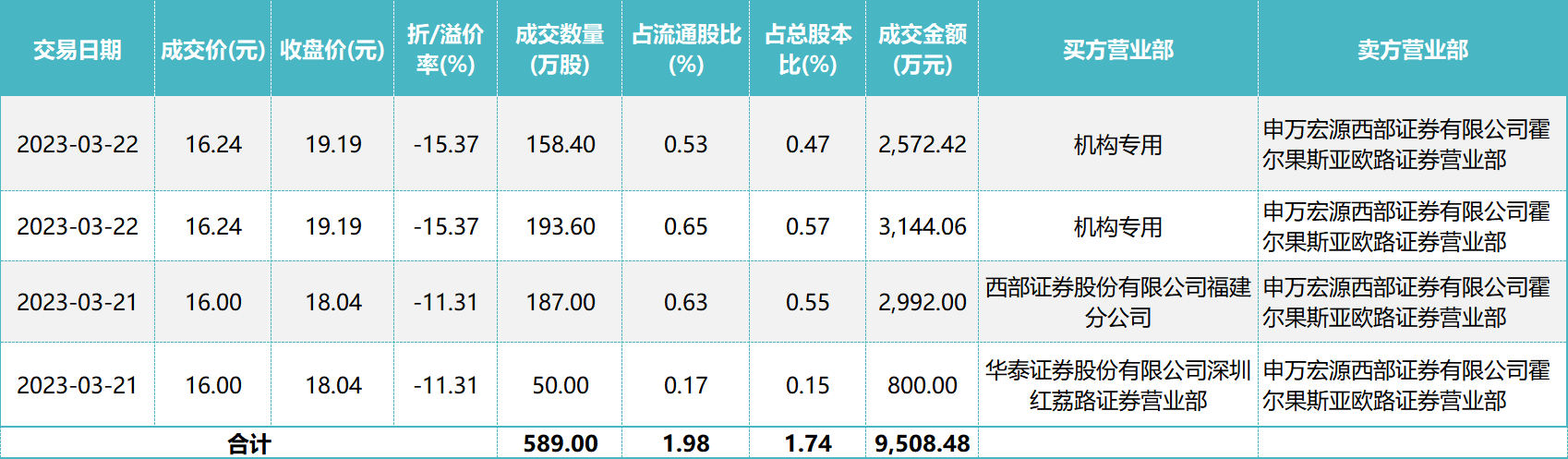 具体而言,3月21日沈飒以成交价16.24元/股,通过大宗交易折价15.37%卖出352万股,套现5716万元。3月22日沈飒以成交价16元/股。通过大宗交易卖出237万股,套现3792万元。