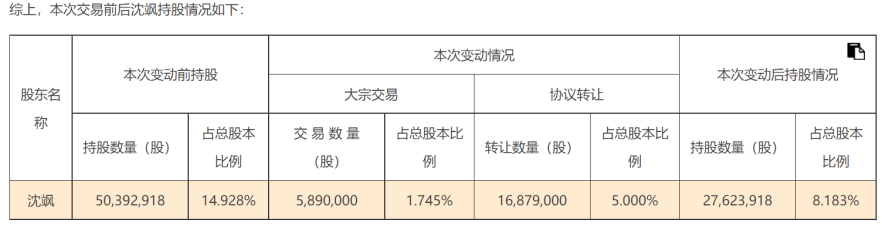 其二,在大宗减持的同时,沈飒又通过协议转让的方式,套现2.74亿元。