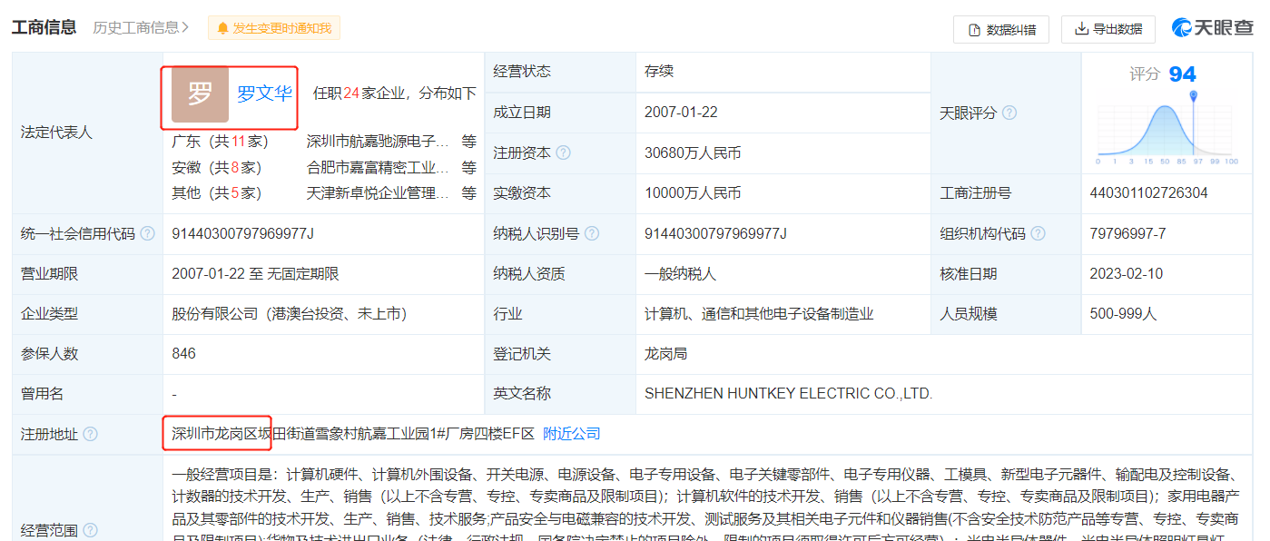 天眼查显示,航嘉系旗下的深圳市航嘉驰源电气股份有限公司注册地也在深圳市龙岗区坂田街道。