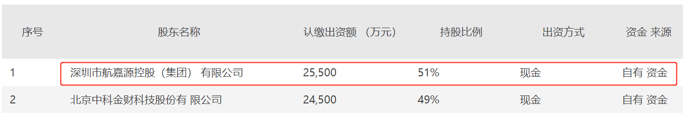 2020年11月6日中科金财曾披露,将与深圳市航嘉源控股(集团)有限公司(以下简称“深圳航嘉源”)共同设立深圳市金源兴信息技术有限公司(以下简称“深圳金源兴”)。