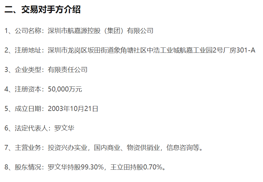 公开信息显示,罗文华为湖南南县人,毕业于北京航空航天大学,硕士研究生学历,高级工程师。1995年在深圳创办航嘉机构,现任航嘉机构董事长兼总裁,同时担任深圳市工商联副主席、深商投资协会副会长等职务。