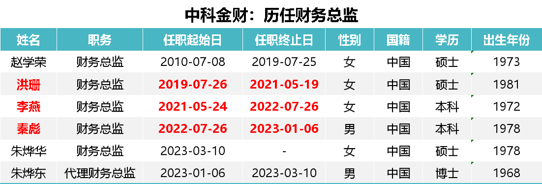 2019年至2023年不到4年时间中科金财换了4个财务总监,任职最短的财务总监任职期不超过半年。