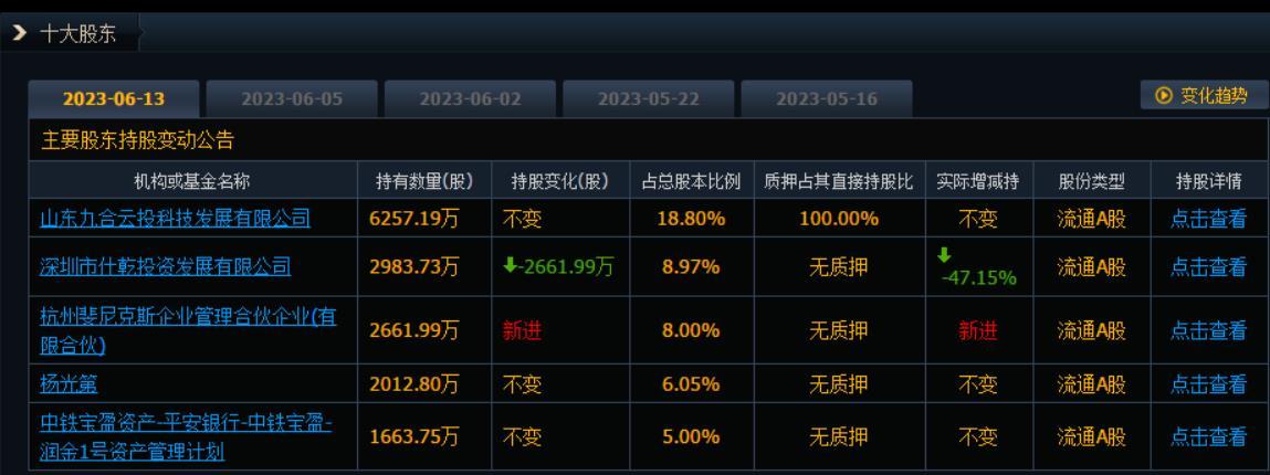 5月12日,威龙股份官宣确认山东九合云投完成过户登记手续,其持股比例占公司总股本的18.80%。经上述权益变化,九合云投成为第一大股东,深圳仕乾退居第二大股东,杭州斐尼克斯新晋为第三大股东。