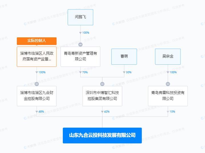 天眼查APP显示,山东九合云投的大股东系淄博市临淄区国有资产监督管理局旗下的国有独资公司——九合财金控股有限公司,该公司持有九合云投48%的股权。此外,深圳市中博智汇科技控股集团有限公司、 青岛弗雷科技投资有限公司分别持股42%、10%,上述两家公司由闫鹏飞、曹萌、吴宗金三名自然人控制。