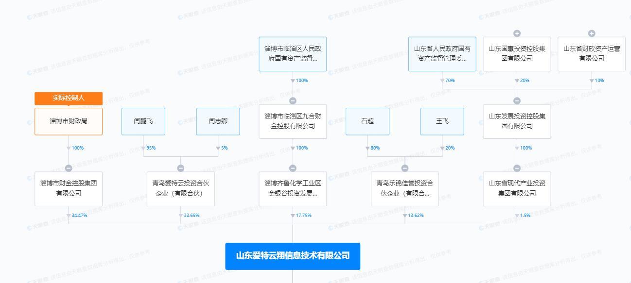 天眼查APP显示,闫鹏飞在山东爱特云翔担任董事长,其与闫志卿合计持有山东爱特云翔32.65%股份。该公司同样具有地方国资背景,其中淄博市财政局持股34.47%,临淄国资持股17.75%,山东国资持股1.5%。