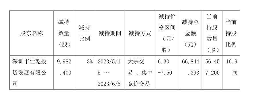 其中,深圳仕乾自5月1日-6月5日通过大宗交易和集中竞价交易减持998.24万股,减持比例为3%,减持价格区间为6.30-7.50元/股,减持金额6684.44万元。
