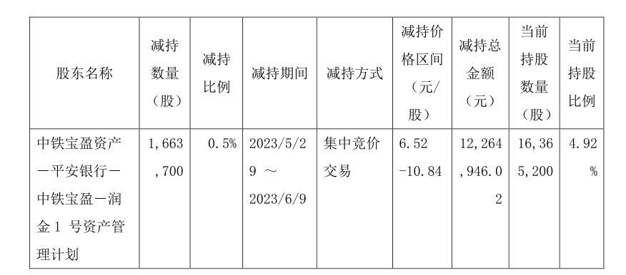 其中,自5月29日起至6月9日,中铁宝盈通过集中竞价方式减持166.37万股,减持比例为0.5%,减持价格区间为6.52-10.84元/股,减持金额1226.49万元,当前持股比例占总股本的4.92%。