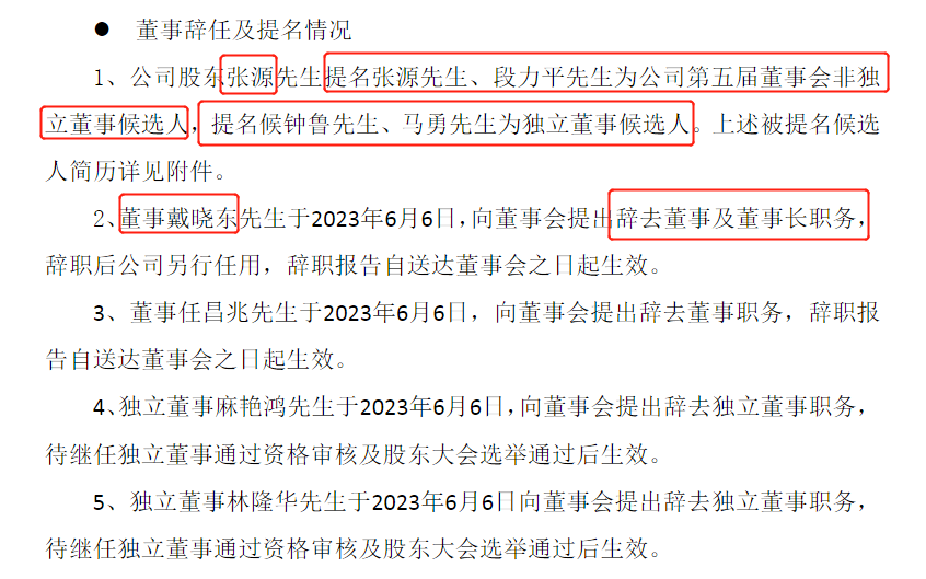 此外,在还未成为上市公司第二大股东时,张源就开始将自己的人马安插在公司董事会中。6月6日的董事会上,张源提名自己、段力平为公司第五届董事会非独立董事候选人,提名候钟鲁、马勇为独立董事候选人。彼时,张源还未实施增持,持股比例不足5%,为公司单一第三大股东。前述提名均获通过。与此同时,董事长戴晓东及其1名董事、2名独立董事等4人均辞职。