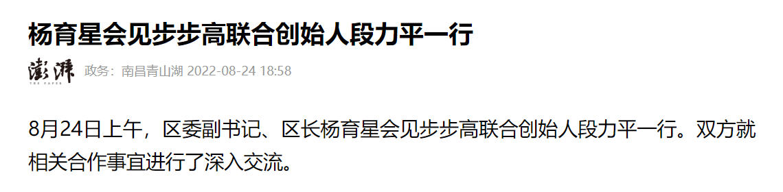 而根据公开信息,段永平有一个哥哥名为段力平,曾投资嘟嘟换电。 据江西南昌青山湖区官方澎湃号消息,2022年8月24日上午,区委副书记、区长杨育星会见步步高联合创始人段力平一行,双方就相关合作事宜进行了深入交流。