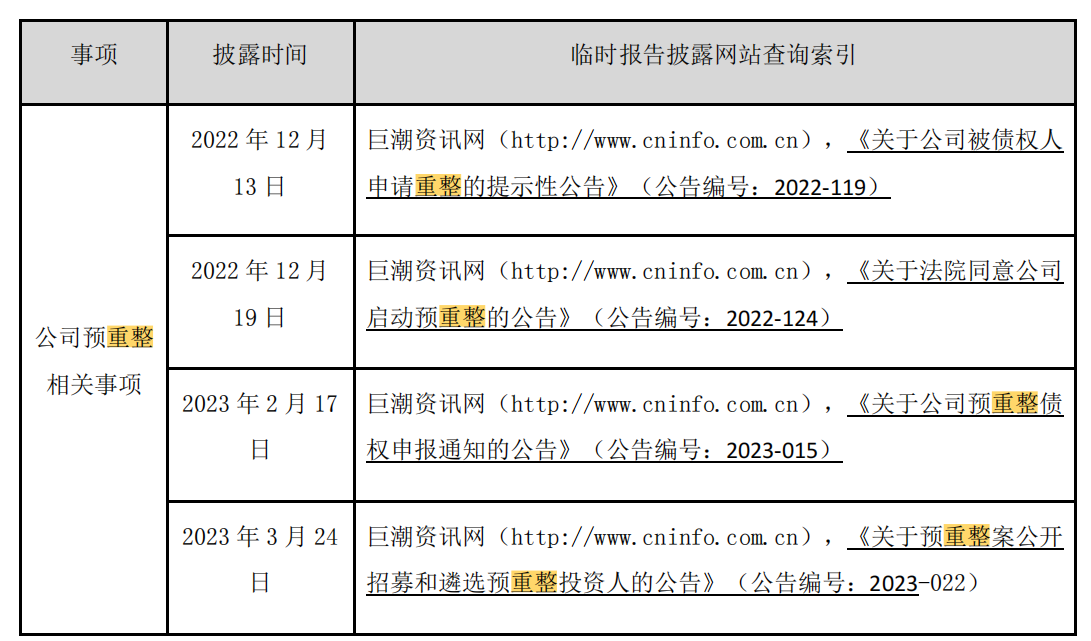 2022 年 12 月 13 日,债权人江苏炎旭工程科技有限公司以公司不能清偿到期债务且明显缺乏清偿能力,但仍具备重整价值为由,向南京中院申请对公司进行重整,并申请先行启动预重整程序。
