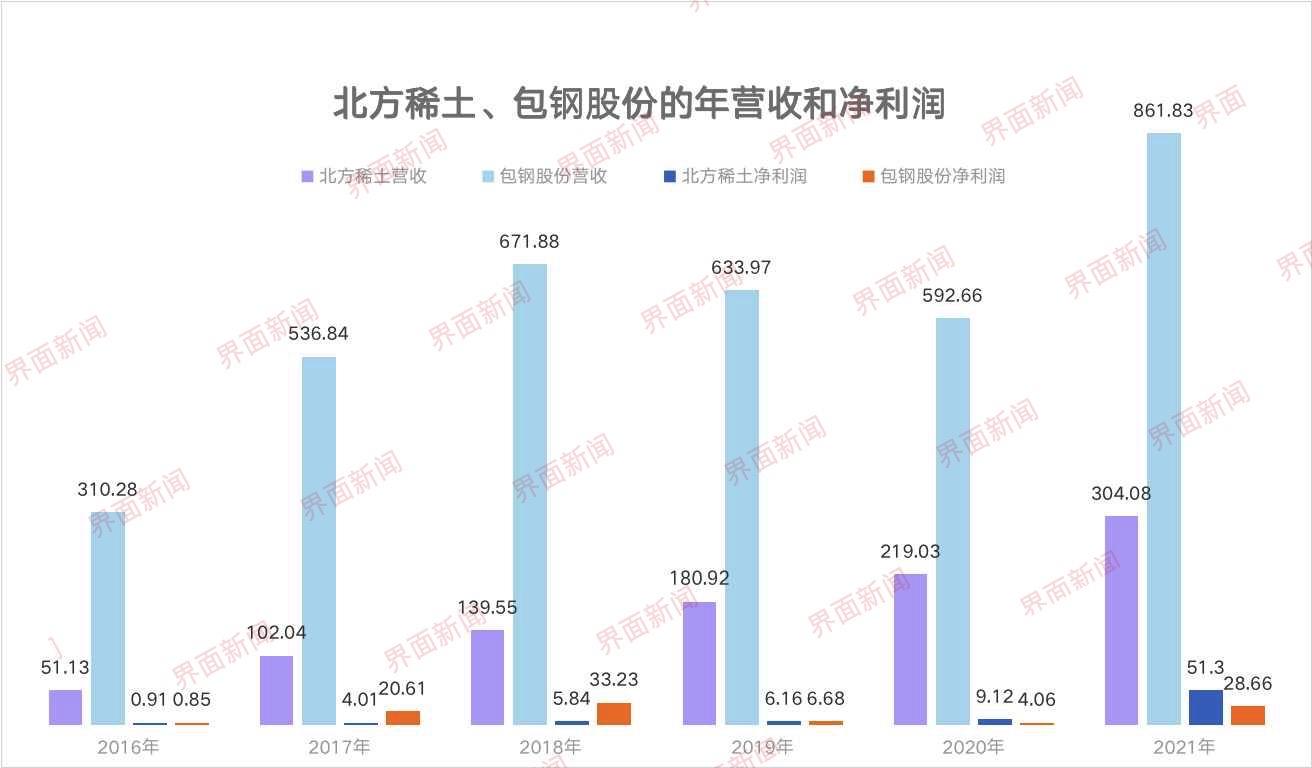 包钢股份的业绩也在这一年被北方稀土反超。2020年,北方稀土净利润为9.12亿元,三年来首次超过包钢股份。次年,北方稀土净利润跃升至51.3亿元,大幅领先净利润28.66亿元的包钢股份。