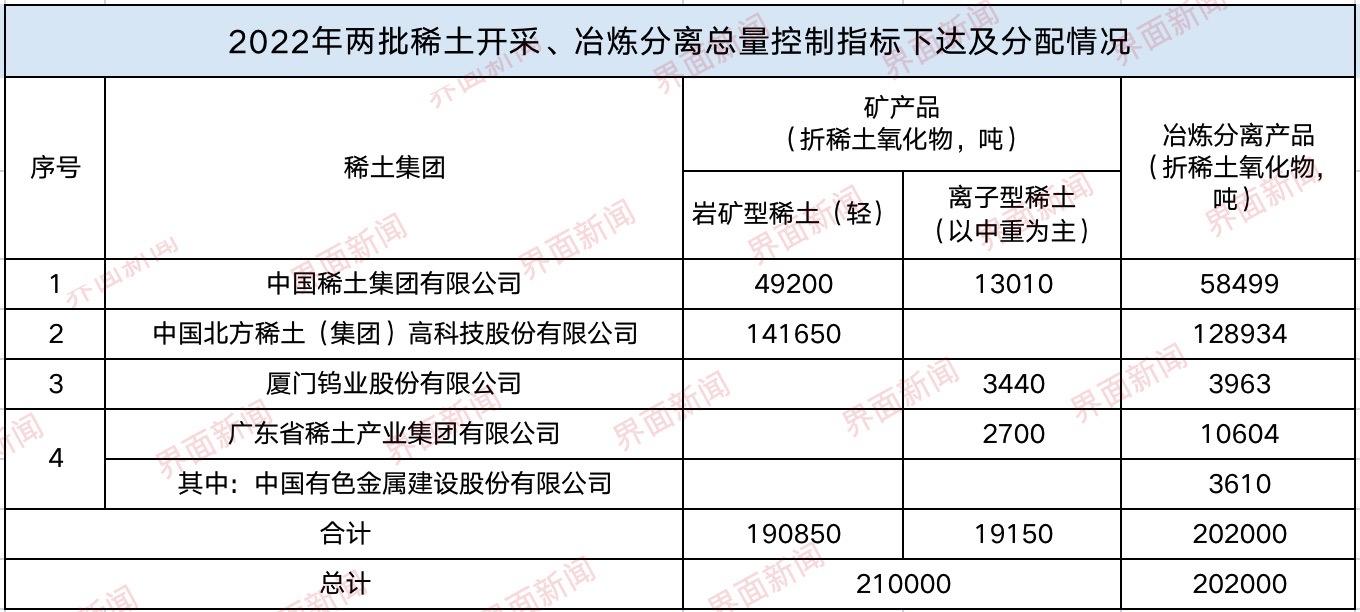 稀土是国家严格实行生产总量控制管理的产品,任何单位和个人不得无指标和超指标生产。接收指标的四大稀土集团为北方稀土、中国稀土集团、厦门钨业(600549.SH)和广东稀土集团。