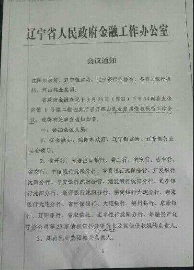 据了解,参加辽宁省金融办在沈阳市友谊宾馆召开的辉山乳业集团债权银行工作会议的债权银行及其他债权机构共23家,包括辽宁省中行、省工行、省农行、平安银行沈阳分行等。