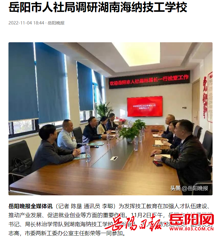 2022年岳阳市人社局党组书记、局长林治学带队到湖南海纳技工学校实地调研。市人社局党组成员、副局长刘志高,市委两新工委办公室主任彭荣等一同参加。