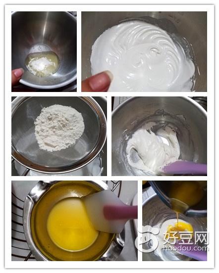 B: 1、在蛋白中加入盐、柠檬汁搅打至起泡,分3次加入细砂糖。