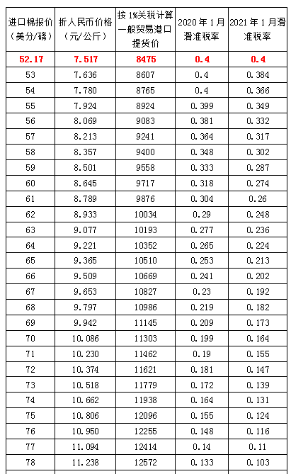 中国棉花网专讯:按2021年棉花进口滑准关税计算公式及1月份的海关适用汇率(6.5355),当进口棉价格在97.17美分/磅以上(含97.17美分/磅,完税价约14000元/吨),滑准税按照固定280元/吨进行征收;而当外棉价格在52.17美分/磅-97.17美分/磅间适用于滑准关税;而当外棉价格低于52.17美分/磅时,则按固定税率40%征收。详见下表: