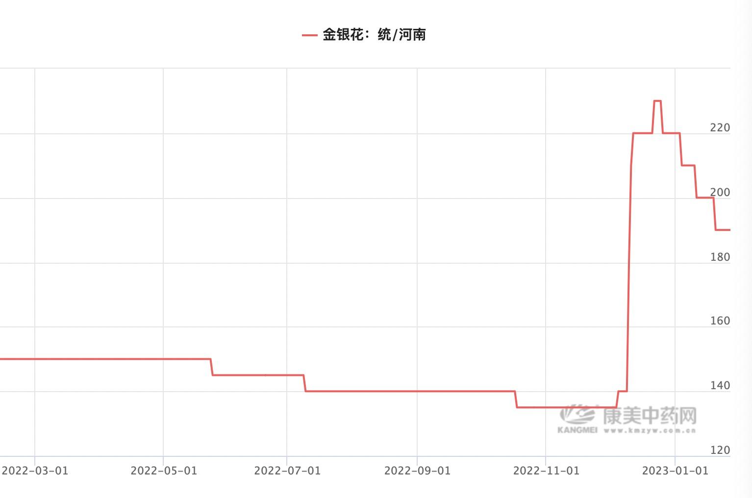 金银花的原料价格也上演了类似的“疯狂”。界面新闻走访现场的金银花批发商户得知,在2022年底短短不到一个星期内,统货金银花的价格也同比上涨,从2022年12月9日最初的140元/kg涨至12月23日最高时的230元/kg。
