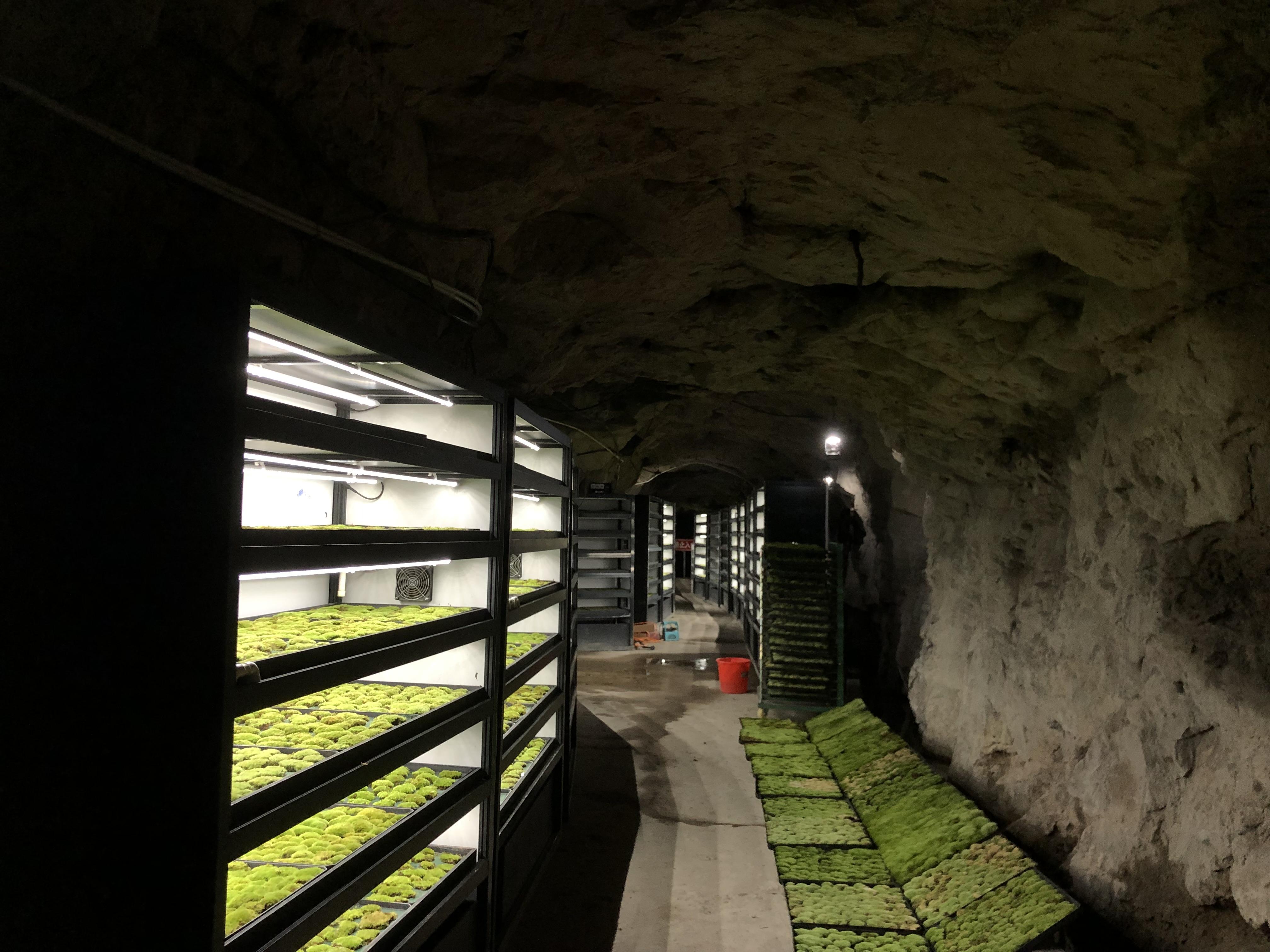 润生在毛垟的一个种植基地由当地的一处泄洪洞改造而来。山洞内湿润微凉,电灯带来的光亮沿着山洞弯曲的墙壁扩散开来,一个连一个的多层架子上面放着50 cm x 50 cm的托盘,苔藓在其中完成生长阶段。