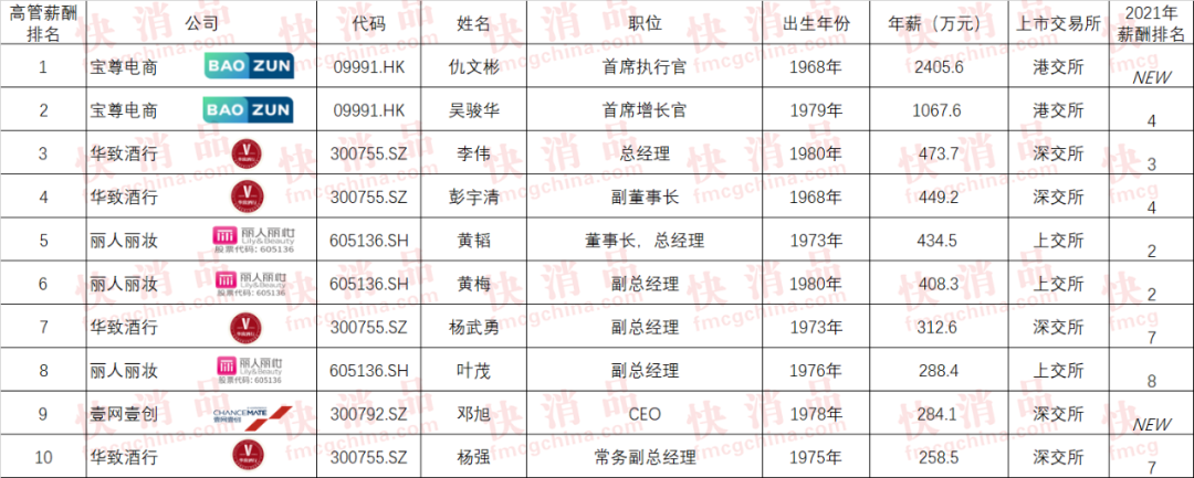 宝尊电商首席运营仇文彬先生,宝尊电商首席增长官吴骏华先生,华致酒行总经理、董事李伟先生,2022年薪酬分别为2405.6万元、1067.6万元、473.7万元