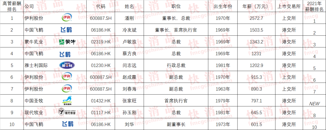 前3位分别为伊利股份董事长,总裁潘刚先生、中国飞鹤董事长,首席执行官冷友斌先生、蒙牛乳业总裁卢敏放先生,2022年薪酬分别为2572.7万元、1503.5万元、1343.2万元