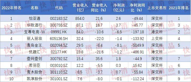 优趣汇(02177.HK)2022年实现营收23.8亿元,同比下降21.6%,净利润为-1.2亿元,同比下降486.9%,位列“2022年中国大快消上市公司之经销商/代运营10强”第六位,为本次新上榜公司。