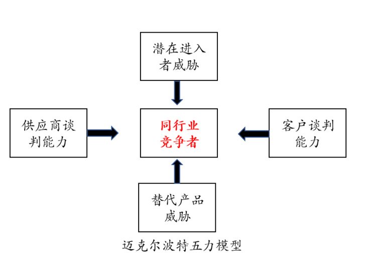 就公司竞争力方面,我认为波特五力模型是一个很好的工具,其包括公司在同行业的竞争实力、与供应商的谈判能力、与客户的谈判能力、潜在进入者的威胁、替代产品的威胁。