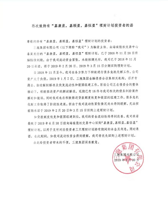 11月20日,三胞集团向持有以上三项理财计划的投资者发函称,以上理财计划由海南股权交易中心备案发行,融资主体为三胞集团,理财计划将于2018年11月20日陆续到期,因近期公司流动资金紧张,不能如期回购。三胞集团承诺最晚于2019年2月20日前回购2018年11月份到期的理财计划,最晚于2019年3月15日前回购2018年12月份及1月份到期的理财计划。