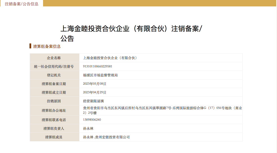 界面新闻查阅国家企业信用信息公示系统发现,前文提到的上海金睦投资合伙企业(有限合伙)已发布清算备案信息,注销原因为经营期限届满,清算组成立日期为2023年05月08日,清算组备案日期为2023年05月08日。