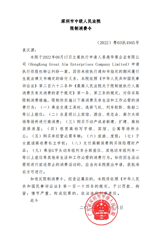 限消令显示,深圳市中级人民法院于2022年8月17日立案执行申请人香港华策企业有限公司(下称“华策公司”)申请执行其股权转让纠纷一案。因袁汉源未按执行通知书指定的期间履行生效法律文书确定的给付义务,深圳市中级人民法院依照有关规定,对其采取限制消费措施。