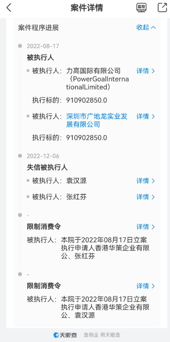天眼查显示,被执行人履行情况为全部未履行。2022年12月6日,袁汉源和张红芬因“其他规避执行”被列为失信被执行人,同时被发布“限制消费令”。