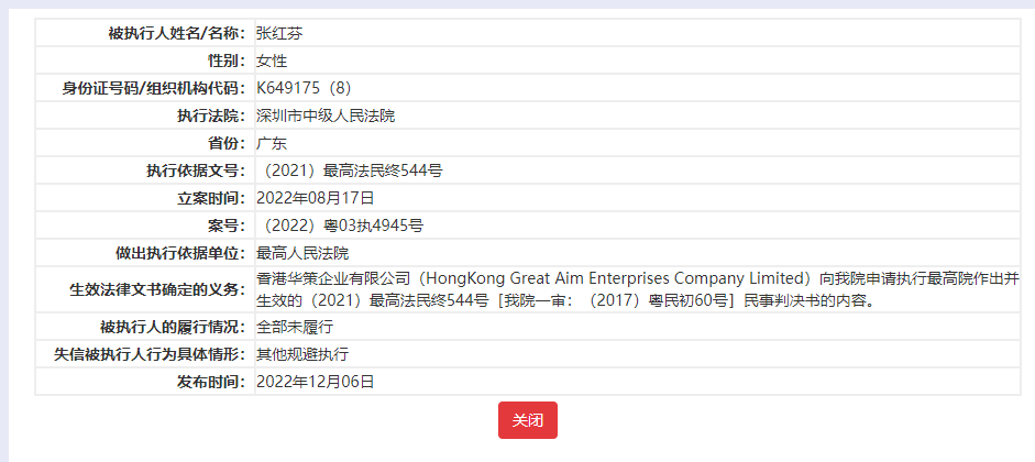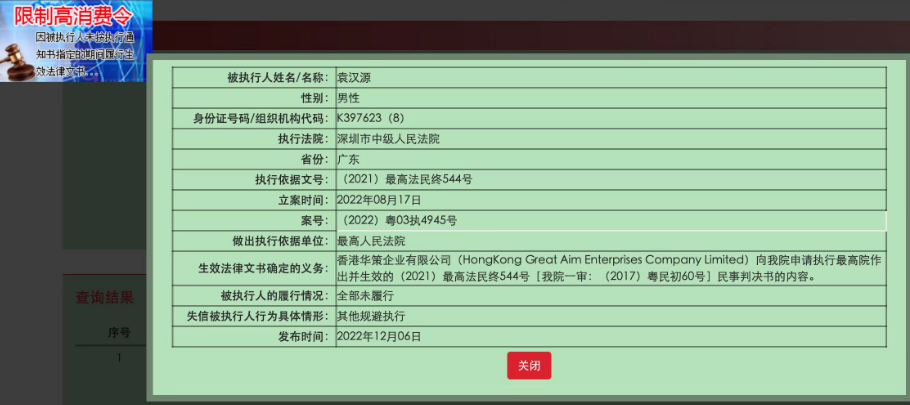 知情人士提供的相关信息显示,2022年12月,中国执行信息公开网失信被执行人名单中,袁汉源和张红芬均在列。