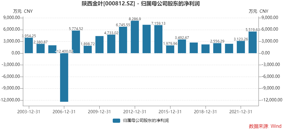 陕西金叶营业收入在2021年才突破10亿元。业绩也未平稳增长,归属于上市公司的净利润峰值发生在2012年,为8286.90万元,之后萎缩。近六年来,其净利润规模多不足3000万元。