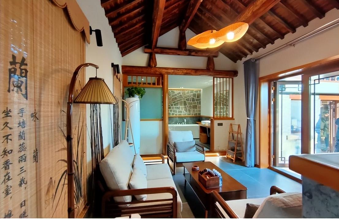 沿着小路拾阶而上,村居改建的民宿鳞次栉比,暖棕色的房梁、桌椅韵味十足。